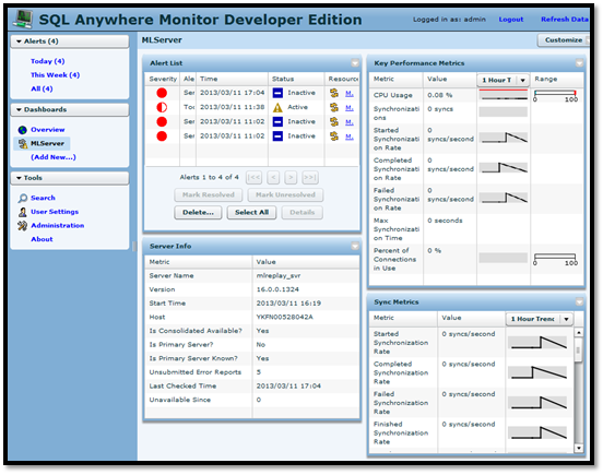 24時間365日SQL Anywhereサーバーや Mobile Link サーバー等の状態を管理します。モニターDBに情報を収集、ネットワーク内の複数のDBの遠隔集中監視も可能です。
