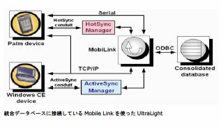 Ultra Light アプリケーションは、Mobile Link 同期技術と統合することができます。これにより、Ultra Light データベースのデータを中央の統合データベースと同期させることができます。Mobile Link 同期技術を使用して、Adaptive Server Anywhere (SQL Anywhere)、Adaptive Server Enterprise、IBM DB2、Microsoft SQL Server、Oracle とデータを同期させることができます。同期により、エンタープライズ・データのサブセットを各デバイスに保存し、そのデータを操作した後に、統合データベースに戻すことができます。Ultra Light アプリケーションでは、Mobile Link 同期技術を利用することで、柔軟性とスケーラビリティを実現しています。SQL Anywhere Studio のインストールには、Ultra Light データベースの作成、管理、導入を行うためのさまざまな Ultra Light ユーティリティが含まれています。