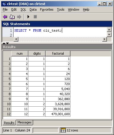 );このテーブルは、CLR 関数からの戻り値を、digits と factorial という 2 つのカラムに保存します。