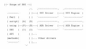 重要なのは、DBI が単なるインタフェース、つまりアプリケーションと 1 つ以上のデータベース・ドライバ・モジュールの間を接続する層であるということです。このモジュールは、実際の作業を実行するドライバ・モジュールです。DBI は、ドライバが内部で機能するための標準のインタフェースとフレームワークを提供します。