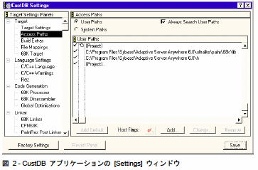[Access Paths] オプションでは、Adaptive Server Anywhere (SQL Anywhere) インストールの h ディレクトリへのパスを指定します。このディレクトリには、すべてのヘッダ・ファイルが入っています。Palm 固有のランタイム・ライブラリへのパスも指定してください。
