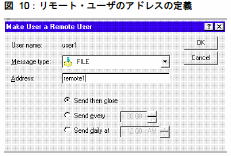 e) リモート・ユーザを定義します。図 8 と手順 b) を参照してください。手順 c) で作成したユーザ user1 を右クリックし、ポップアップ・メニューから [リモートを設定] を選択します。[アドレス]に remote1 と入力します (注意:任意のアドレスを指定できますが、ここではわかりやすくするため remote1 と入力します)。