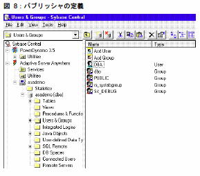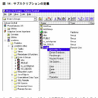 図 8 と手順 b) を参照するか、Sybase Central の左側にある [ユーザ & グループ] フォルダをクリックします。user1 を右クリックし、ポップアップ・メニューから[サブスクリプションの作成(Subscribe To)] を選択します。
