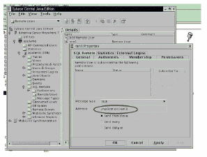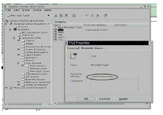 前述のように、リモート・データベースは remote1.db として抽出されています。このデータベースは、Win NT 4.0 のリモート・サイトに展開され、データベースへの接続が Sybase Central を使用して確立されています。ここで、ftp レプリケーションを実行するために、アドレスを変更する必要があります。次の画面は、変更後のアドレスを示しています。選択された [Message Type] は ftp レプリケーションで、パブリッシャのアドレスは rem1 に設定されています。リモート・ユーザのアドレス (統合データベース) は cons に設定されています。