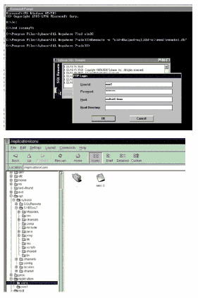 次の画面では、dbremote が ftp サーバにログインし、/replication/rem1 ディレクトリにあるメッセージを取得し、メッセージを適用し、メッセージを統合データベースに送信しています。このメッセージは、/replication/cons フォルダに rem1.0 というファイルで保存されています。