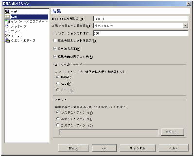 [オプション] ダイアログでは、コンソール・モードで結果セットを返す方法を設定することができます。オプションは [最後]、[なし]、[すべて] の 3 つです。コンソール・モードでも、.SQL スクリプトを使用してデータベースに対して SQL 文を実行するときにISQL_PRINT_RESULT_SET オプションを使用すれば、このオプションを設定できます。