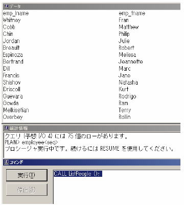 最初の結果セットは、ただちに [データ] ウィンドウに返されます。[統計情報] ウィンドウには、プロシージャがまだ実行中であり、続行するときは RESUME 文を使用するようにという指示が表示されます。