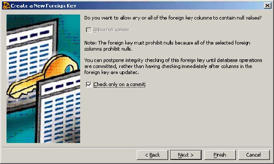 - Sybase Central で外部キーを作成する場合は、ウィザード内で [Check Only on Commit] オプションを選択します。