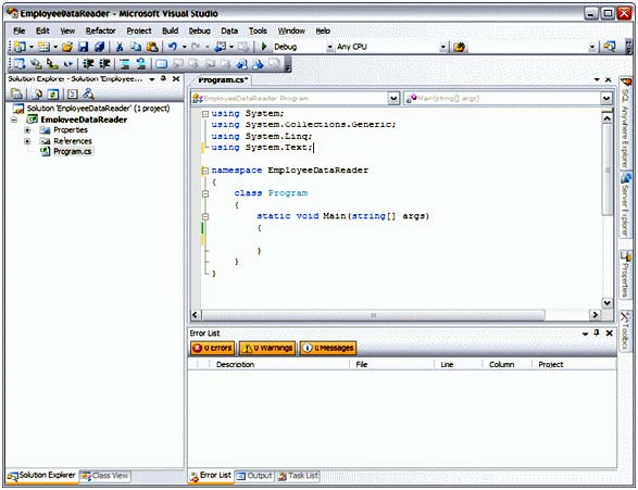 - j. プロジェクトの最初の部分に以下の using ディレクティブを追加します。System.Data および iAnywhere.Data.SQLAnywhere ネームスペースが設定されます。これらのネームスペースには、データベース接続に必要なすべての ADO.NET クラスが含まれています。コード・ファイルは以下のようになります。using System;