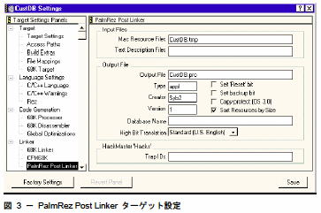[PalmRez Post Linker] パネル (図 3 を参照) では、コンパイラとリンカによって作成されたオブジェクト・コードとリソースから、デバイス用の Palm OS アプリケーションを作成する場合に関連する設定を制御します。重要な設定は次のとおりです。
