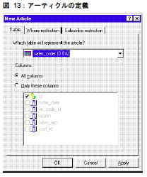 h) [テーブル(Add Table)] をクリックします。[アーティクルを表すテーブルの指定(Which table will represent the article?)] ドロップダウン・メニューで、[sales_order (DBA)] を選択します。[すべてのカラム] を選択します (注意:アーティクルの定義の詳細については、『Sybase Replication Documentation』を参照してください)。