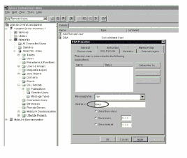前述のように、リモート・データベースは remote1.db として抽出されています。このデータベースは、Win NT 4.0 のリモート・サイトに展開され、データベースへの接続が Sybase Central を使用して確立されています。ここで、ftp レプリケーションを実行するために、アドレスを変更する必要があります。次の画面は、変更後のアドレスを示しています。選択された [Message Type] は ftp レプリケーションで、パブリッシャのアドレスは rem1 に設定されています。リモート・ユーザのアドレス (統合データベース) は cons に設定されています。