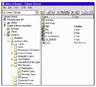・Sybase Central の左側のウィンドウ枠で [ユーザとグループ] フォルダを開きます。