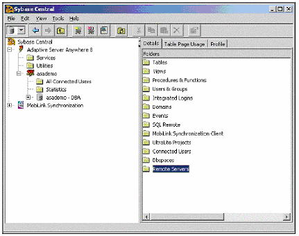 3. Sybase Central で、[リモート・サーバ] フォルダを開きます。