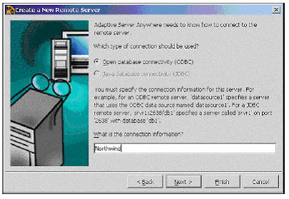 7. リモート・サーバとの接続で使われる接続タイプを選択します(サーバ・タイプにより、接続タイプに制限がある場合があります)。[オープン・データ・コネクティビティ(ODBC)] を選択し、[接続情報] フィールドに Northwind と入力します (同名の ODBC データ・ソースが必要)。 [次へ] をクリックします。