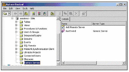 8. [完了] をクリックします。 Sybase Central に Northwind リモート・サーバが表示されます。